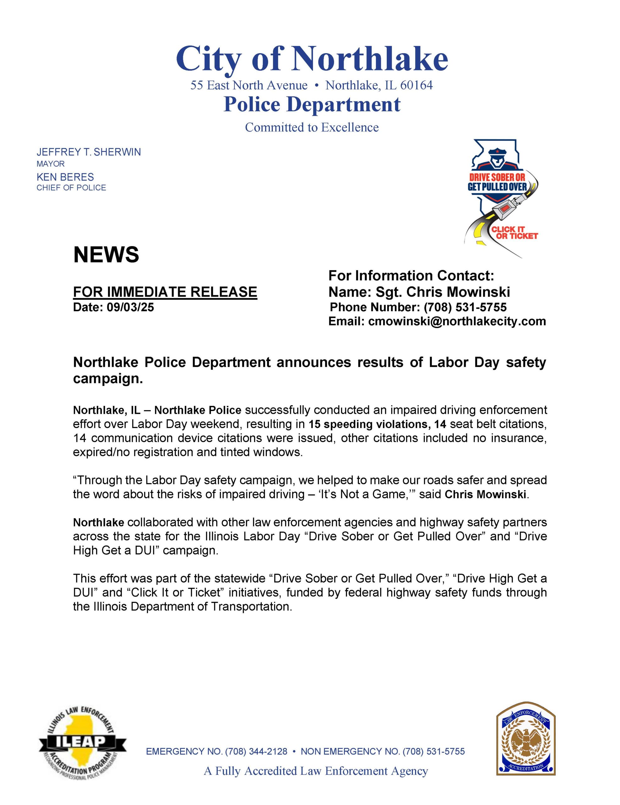 Northlake Police Department Announces Results of Labor Day Safety Campaign